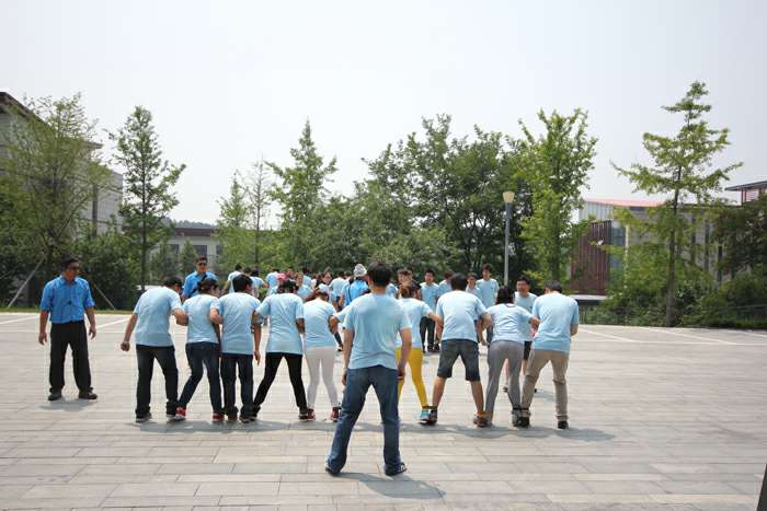 学员们在教练的指导下练习拓展项目“龙行天下”